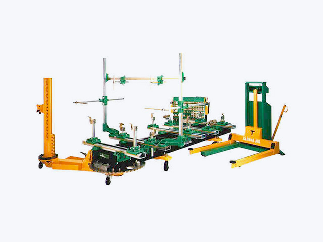 イタリア製フレーム修正機「グローバル・ジグ」は、ジグ式ユニバーサルシステムにより、国産車から輸入車まで幅広く対応可能です。計測・固定・修正を同時に行うことで、従来より合理的かつ確実な作業ができ、足回りの取り付け角度修正にも対応します。